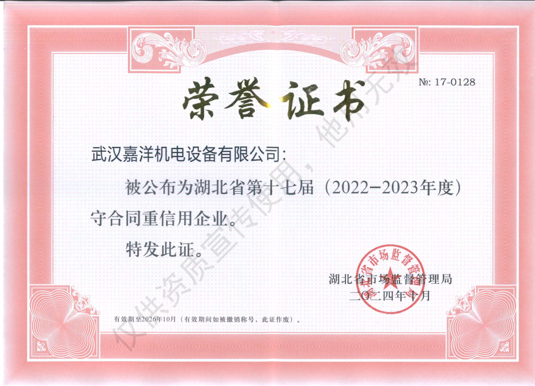 根據(jù)《湖北省合同監(jiān)督條例》《湖北省企業(yè)合同信用狀況公布暫行辦法》相關(guān)規(guī)定,省市場(chǎng)監(jiān)管局組織開(kāi)展了湖北省第十七屆(2022—2023年度)“守合同重信用”企業(yè)公布活動(dòng)。按照企業(yè)自愿申報(bào)、各地市場(chǎng)監(jiān)管部門審核推薦、省市場(chǎng)監(jiān)管局公開(kāi)向社會(huì)征求意見(jiàn)等程序,省局研究同意,公布湖北省第十七屆(2022—2023年度)“守合同重信用”企業(yè),武漢嘉洋機(jī)電設(shè)備有限公司名列其中,喜獲殊榮。