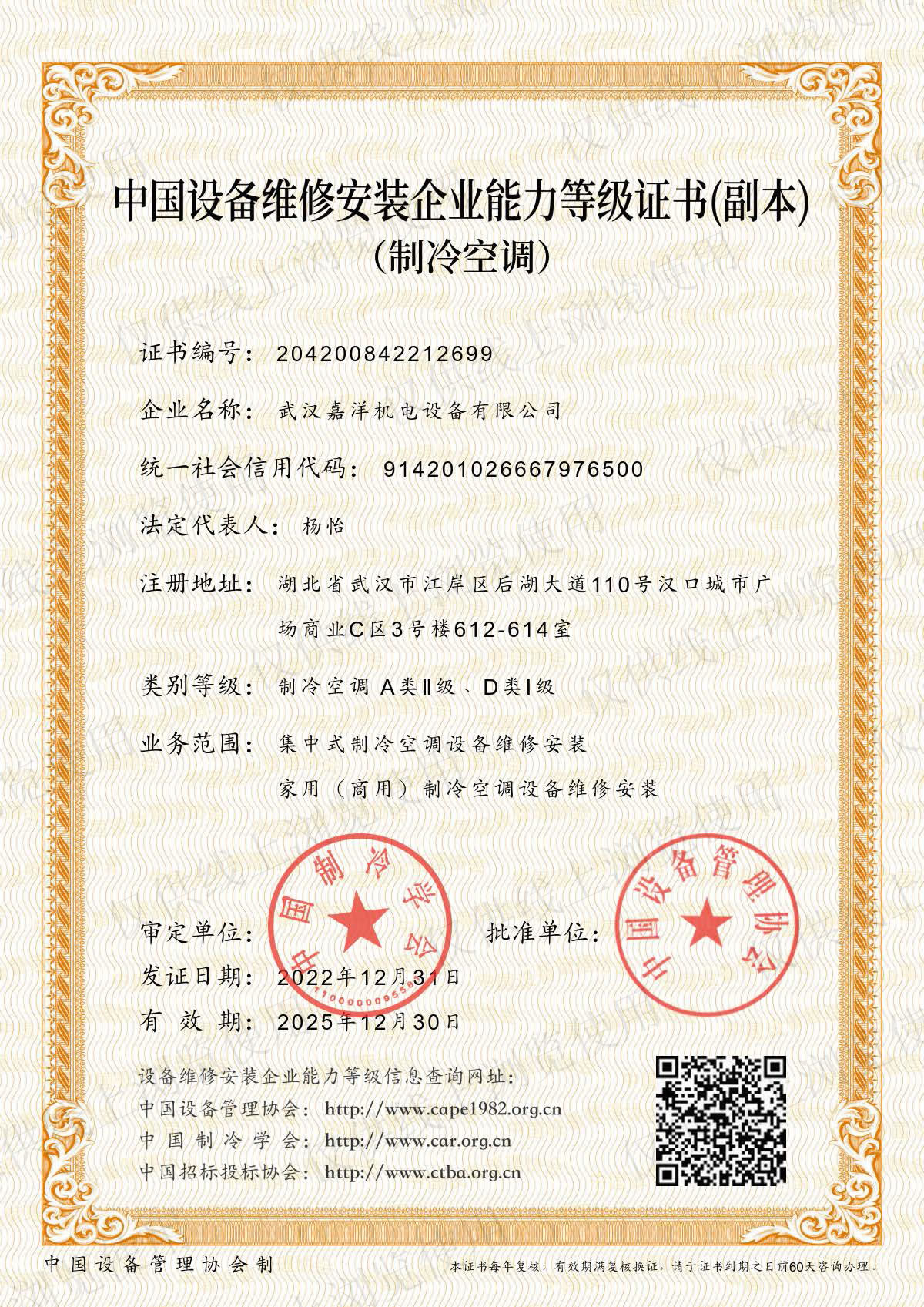 日前,嘉洋機(jī)電榮獲中國設(shè)備維修安裝企業(yè)能力等級證書(制冷空調(diào)),這是繼嘉洋機(jī)電升級建筑機(jī)電安裝專業(yè)承包壹級資質(zhì)之后的又一重量級能力等級證書。