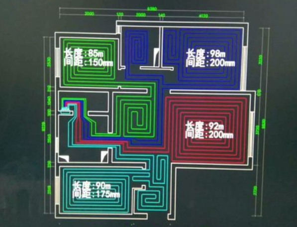 另外需要注意一點(diǎn),如果各個(gè)回路長(zhǎng)度差距過(guò)大,那么地暖循環(huán)內(nèi)的水力很難平衡,可能會(huì)出現(xiàn)部分區(qū)域熱部分區(qū)域不熱的情況,所以一般需要把各個(gè)回路的長(zhǎng)度差距需要控制在20m以內(nèi)。
