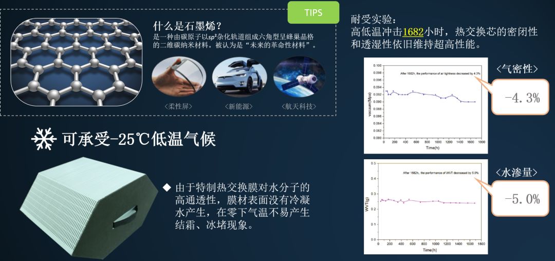 石墨烯膜材具備高導(dǎo)熱性能保證了石墨烯芯塊顯熱回收效率,同時由于膜材的親水性及水分子的高通透性能保證了石墨烯芯塊的潛熱回收效率。