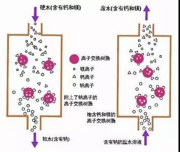 軟水機(jī)原理:陽(yáng)離子樹(shù)脂交換。軟水機(jī)中用樹(shù)脂中吸附的鈉離子置換出水中的該鎂離子,含鈉離子的水流出變成“軟水”,直至所有的樹(shù)脂表面均被鈣鎂離子占據(jù),不能進(jìn)行離子交換位置。